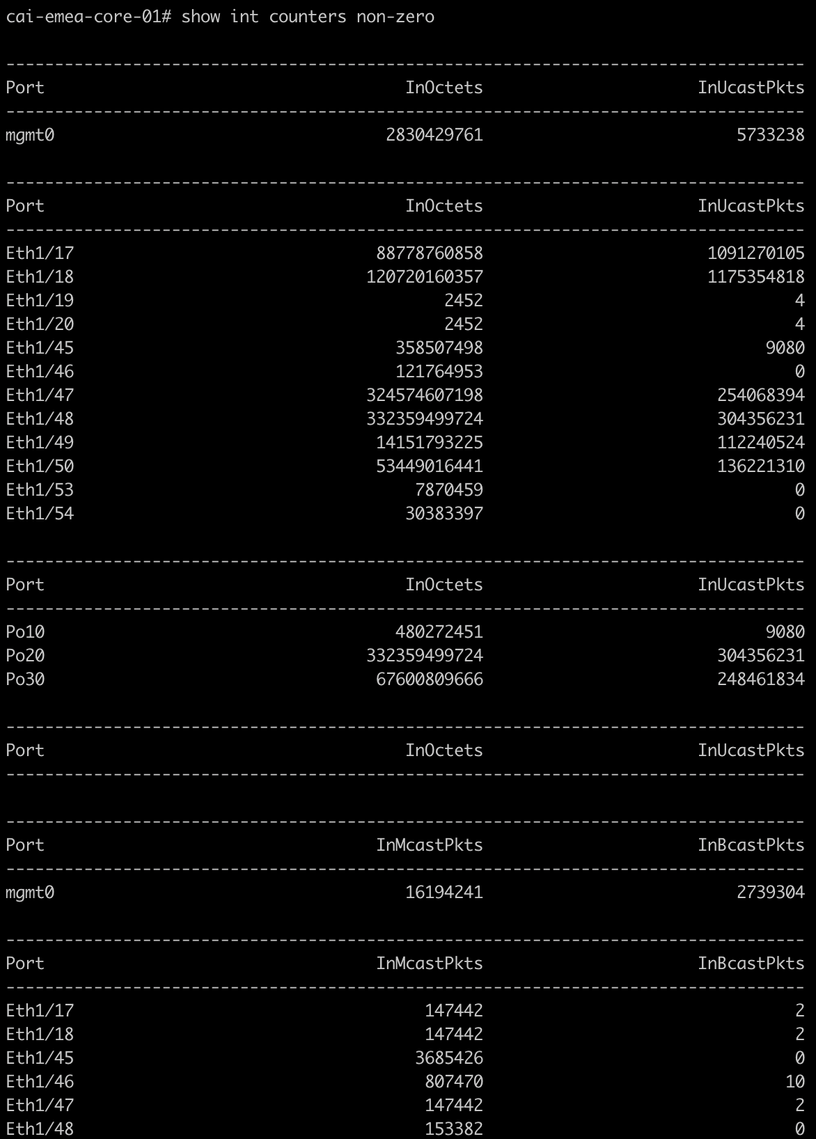 I've had a few issues in my lab network recently which have turned out to be caused by interface issues so I'm documenting a couple of NX-OS commands I find useful