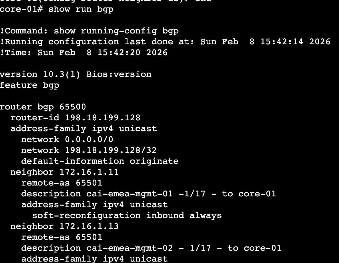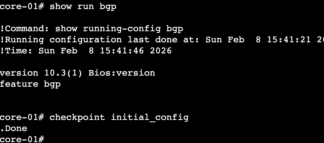 In this example I created a checkpoint without BGP, added some BGP config, showed the diff of the running config vs the initial_config checkpoint, and then rolled back to the initial_config (without the BGP)