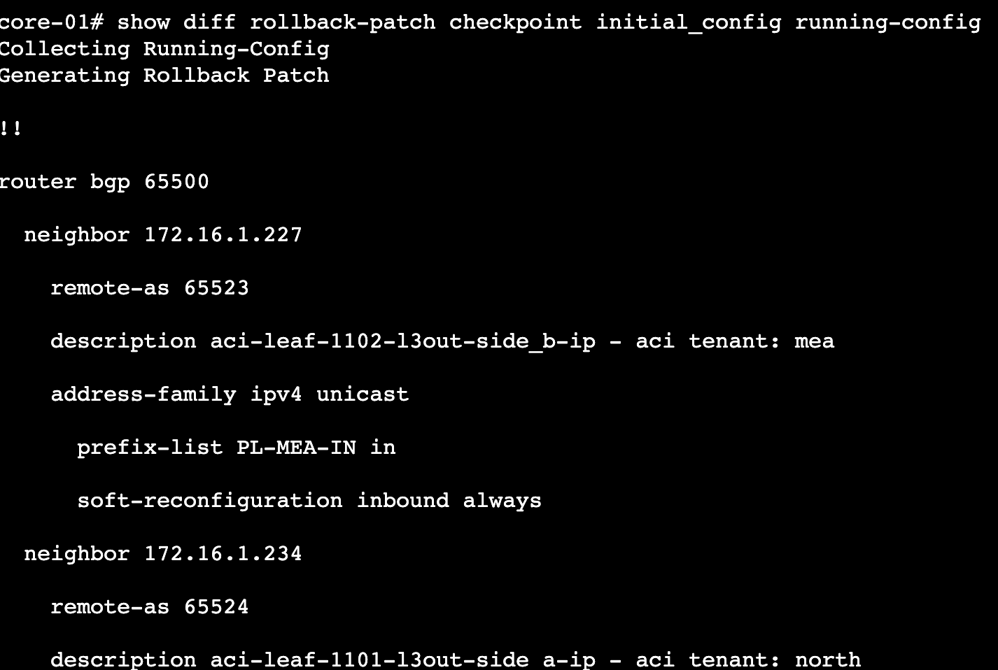 checkpoint initial_configshow run bgpconf trouter bgp 65500 ...show diff rollback-patch checkpoint initial_config running-configrollback running-config checkpoint initial_config atomic