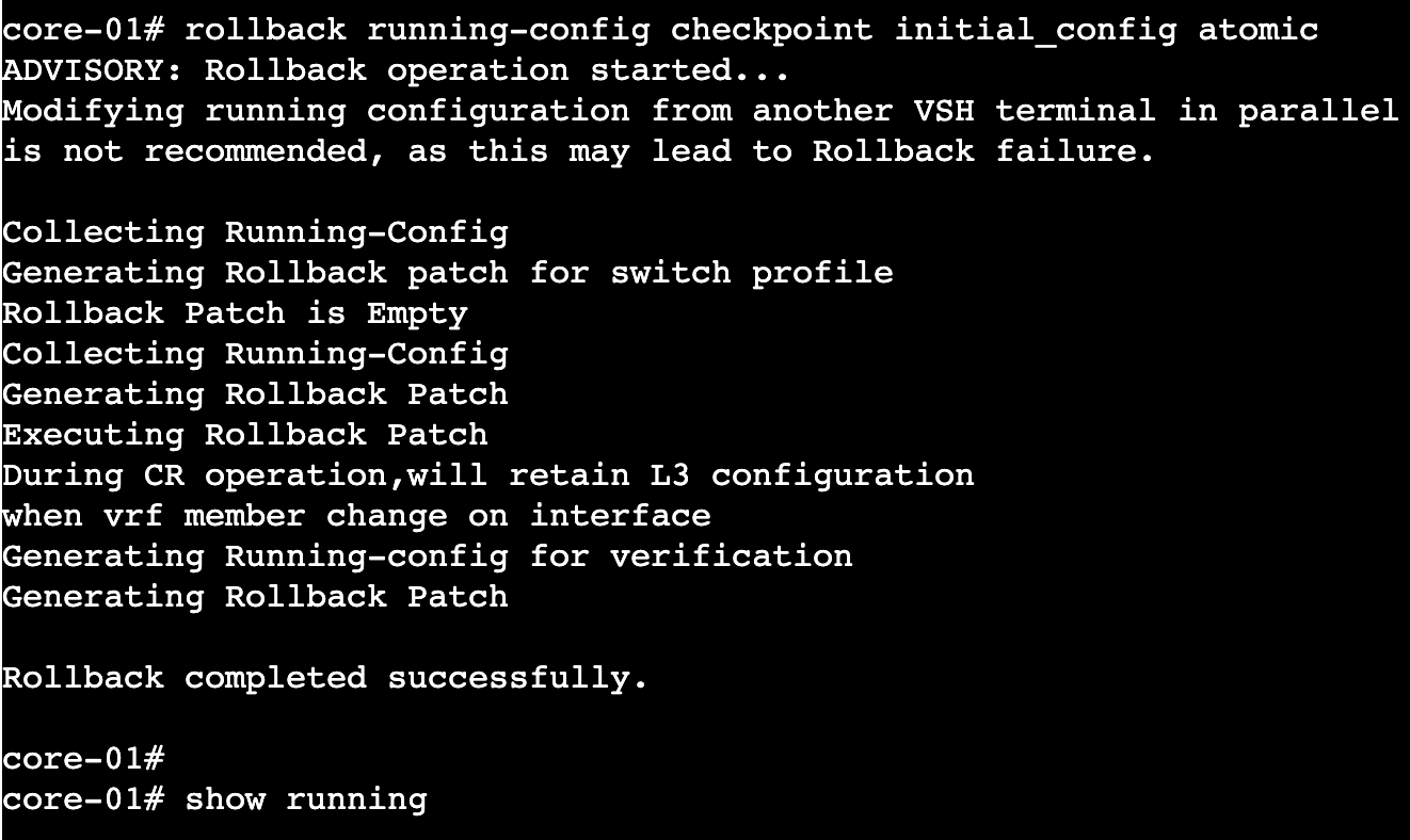 I knew NX-OS had a rollback/commit feature but never got around to playing with it until recently. I also found out about the checkpoint diff feature from a colleague when I needed to test some config and wanted to capture just the new config to put into documentation.