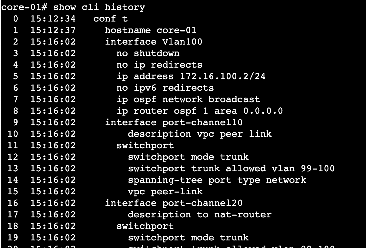 As a bonus, you might find it helpful to use show cli history to show the commands used since logging into the device